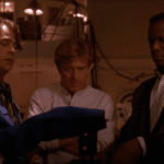 The payoff to the sequence demonstrates Redford’s skills as an actor. After the heist is finished, director Phil Alden Robinson—who gets a co-writing credit with producers Lawrence Lasker and Walter Parkes—cuts to the next morning, where Bishop is closing his account at the bank, receiving in cash the massive amount he transferred. In a single, unbroken shot, we watch as Martin accepts the bills, walks past a security guard and up to a board room, where he returns the money to waiting executives and provides an assessment on the institution’s security protocols.
